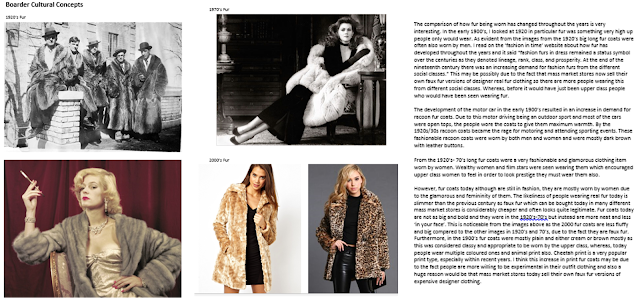 This task involved me analysing fur against its broarder cultural contexts. As shown above I made notes on what I was going to research and what the results of this were. Overall I researched and explained how fur clothing has changed and developed throughout the years. I chose to look at fur in the 20's, 70's and 00's. It was interesting discovering who wore fur before compared to today and the reasons for this. I included images of this and wrote a comparison and explanation for this also.